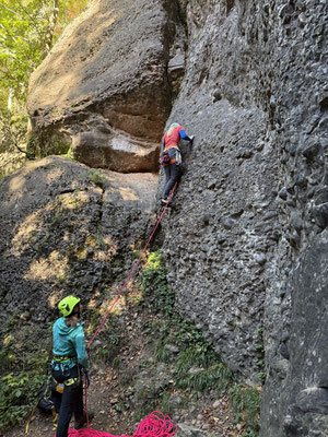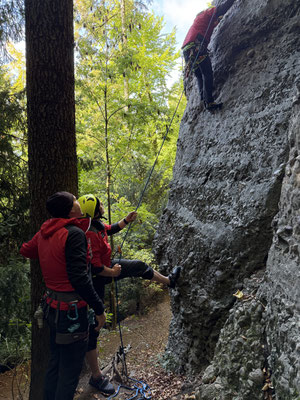 Am 04.10. trafen wir uns um 08:00 Uhr im Bergrettungsheim. Nach einer kurzen Lagebesprechung mussten wir jedoch feststellen, dass das Wetter erneut zu unbeständig für alpines Klettern am Giglturm war. Somit war eine weitere Planänderung nötig: Wir fuhren mit dem Bergrettungsbus nach Bregenz zum Känzele, um dort Sportklettern zu gehen.