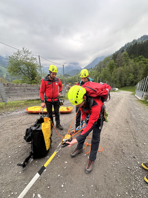 Gegen 18:30 Uhr rückten wir Richtung Vorsäß Schalzbach aus. Vom Parkplatz sind wir mit den Tourenski weiter bis zum Skidepot gegangen. Nachdem wir mittels Koordinaten die genaue Unfallstelle lokalisierten, begannen wir umgehend mit der Erstversorgung der verunfallten Person. Mittels Mannschaftszug und Akja wurde die Bergung aus steilem Gelände durchgeführt. Es stellte sich heraus, dass sich zwei Personen, die zur Hilfe eilen wollten, in felsdurchsetztem Gelände verstiegen haben. Nach dem Aufbau eines Seilgeländers konnten diese aus ihrer misslichen Lage gerettet werden. Anschließend erfolgte im Bergrettungsheim die Nachbesprechung.
