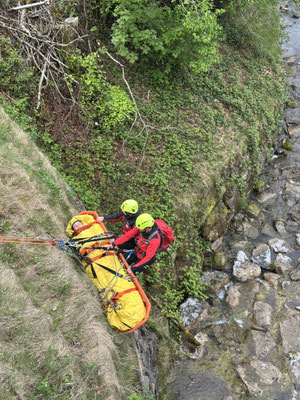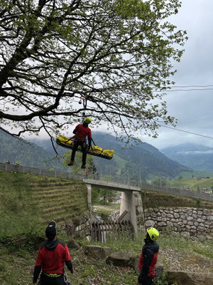 Auch Erste Hilfe kam nicht zu kurz: crABCDE Schema, Schwerpunkt Hängetrauma, Patientenversorgung, Umlagerung mit Schaufeltrage auf die Vakuummatratze.