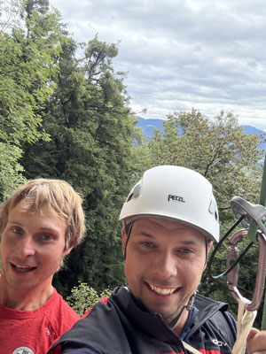 Nach einem kurzen Theorieteil ging’s hoch hinaus: Baumsteigeisen anlegen, Sicherungsleinen richtig einsetzen, Äste überklettern und Gleitschirmpiloten sicher bergen. Mit Profi-Tipps von Baumpfleger Peter lief das Klettern noch besser! 🧗♂️🌳