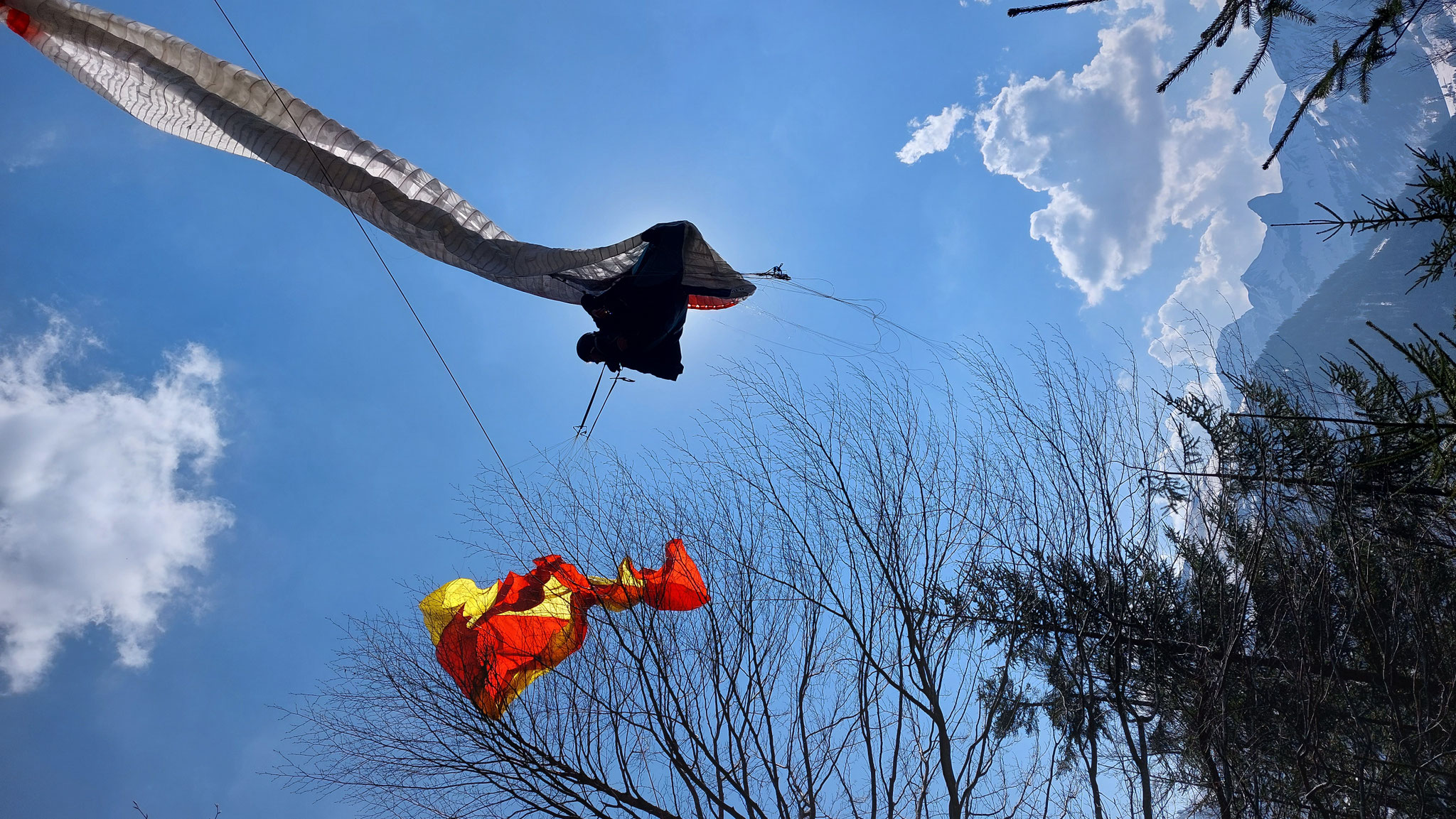 Nach dem Besteigen beider Bäume und Spannen eines Seiles konnten wir Pilot und Schirm unverletzt bergen und anschließend ins Tal begleiten.