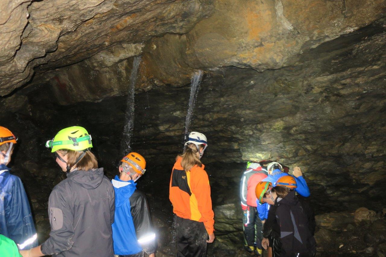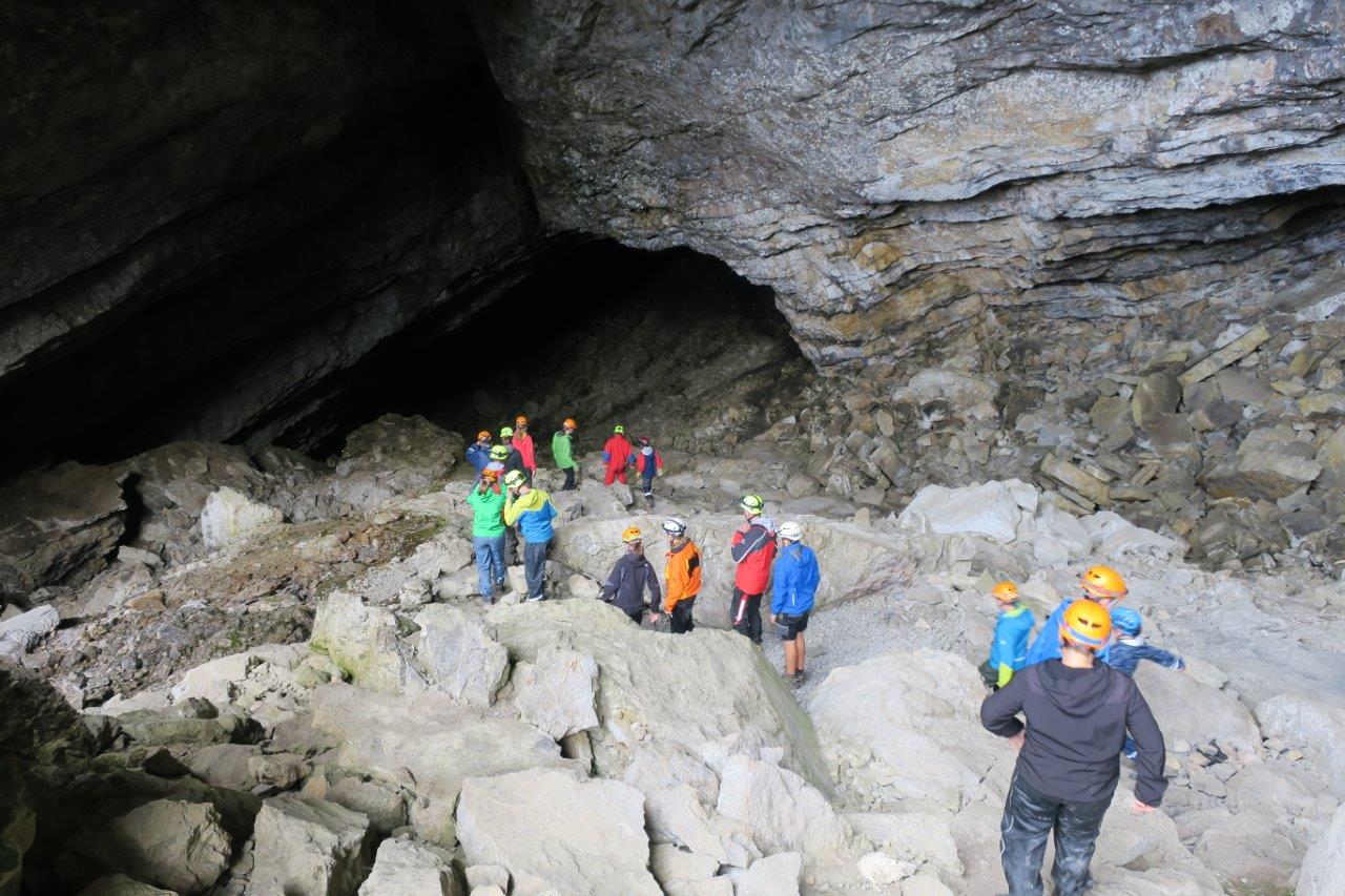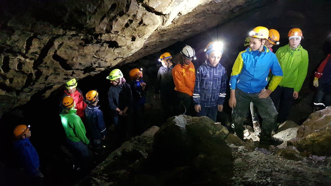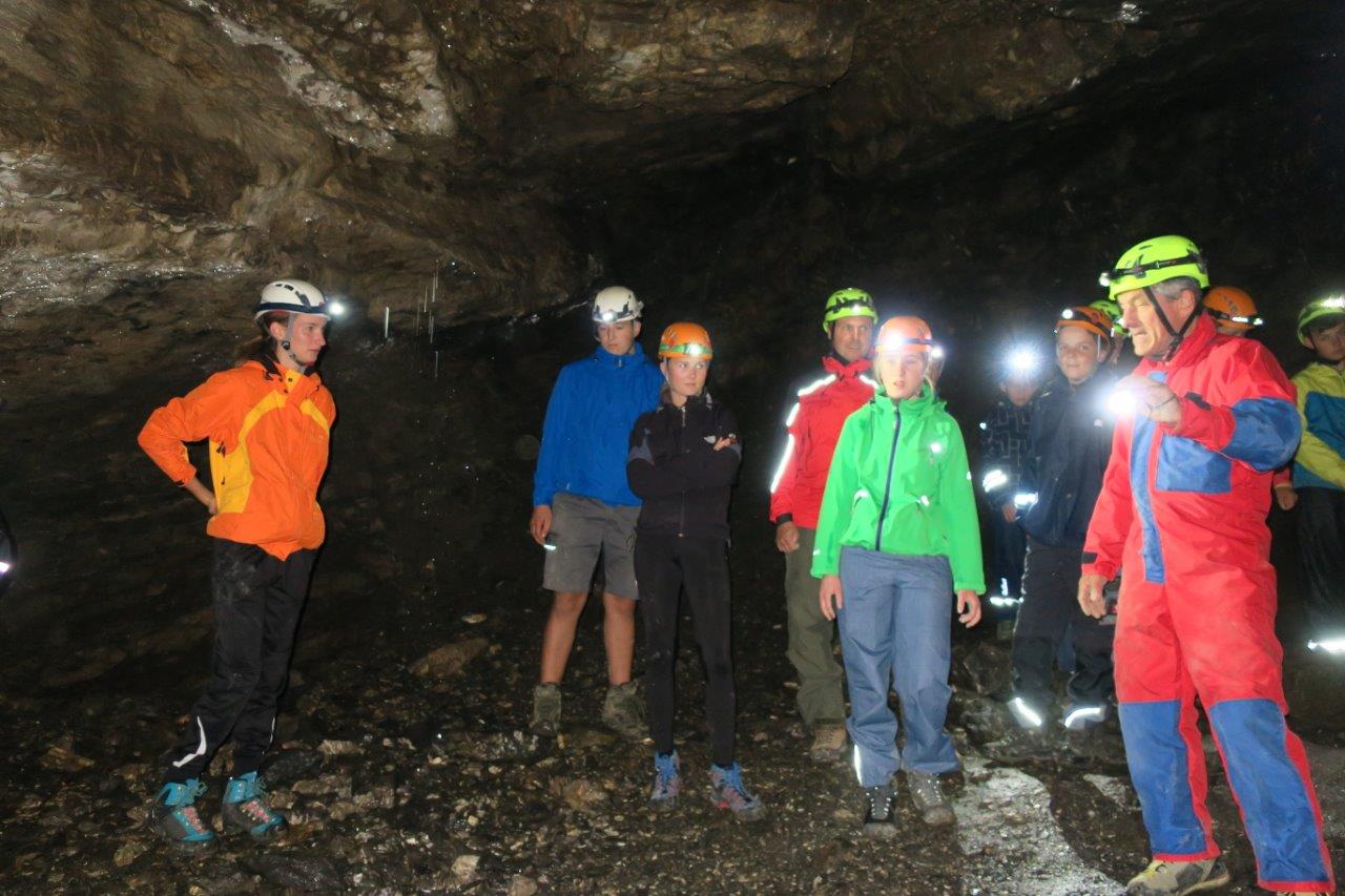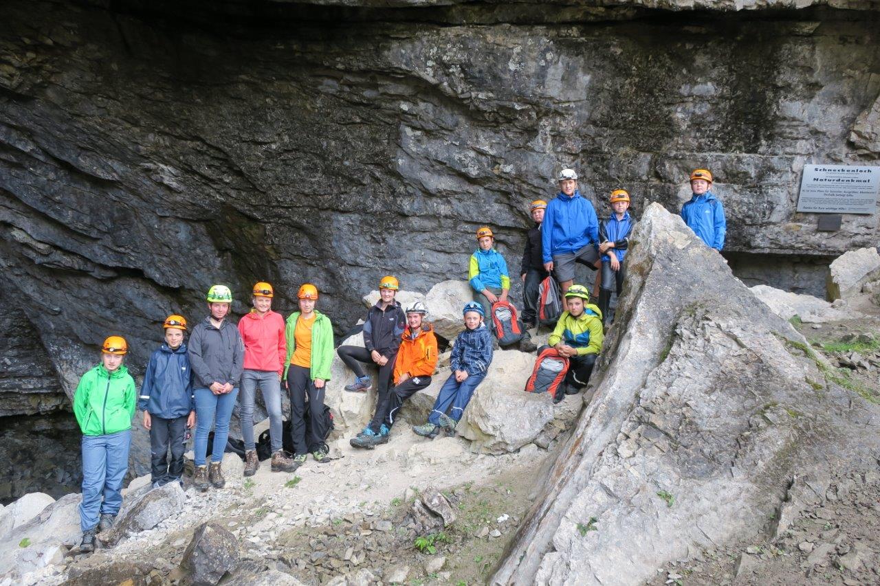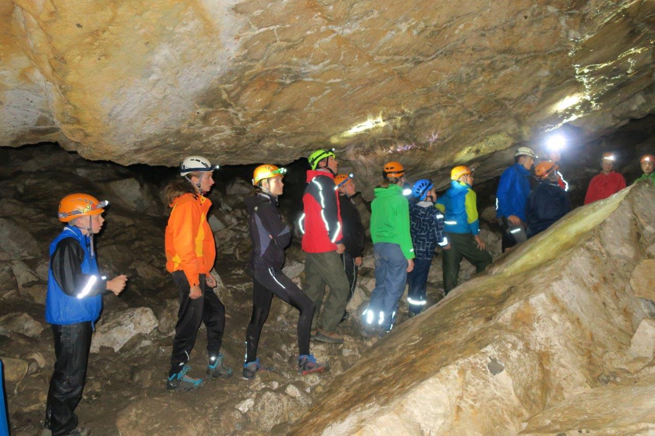 Am Samstag, dem 22. September stand die Schenkenlochhöhle auf dem Programm. Voller Vorfreude trafen wir uns um 12:00 Uhr, wie jedes Mal, im Bergrettungsheim. Anschließend fuhren wir nach Schönebach und dort warteten wir auf unseren Höhlenführer Werner Meusburger aus Bizau. Zusammen liefen wir zum Höhleneingang. Dort zogen wir unsere Helme und Stirnlampen an und wagten uns in die Höhle hinein. Zuerst war es noch eine große Halle, doch es wurde immer enger und enger, 2-mal mussten wir uns durch eine kleine, enge Spalte quetschen, dies erforderte einiges an Überwindung. In der Höhle war es stockfinster, doch zum Glück hatte jeder von uns eine Stirnlampe auf dem Helm. In der Höhle erzählte uns Werner immer wieder interessante Details zur Entstehung- und Erschließung der Höhle. Als wir dann wieder am Höhleneingang angelangt waren, machten wir uns auf den Rückweg zum Gasthaus Egender wo wir mit leckeren „Käsknöpfle“ verwöhnt wurden.