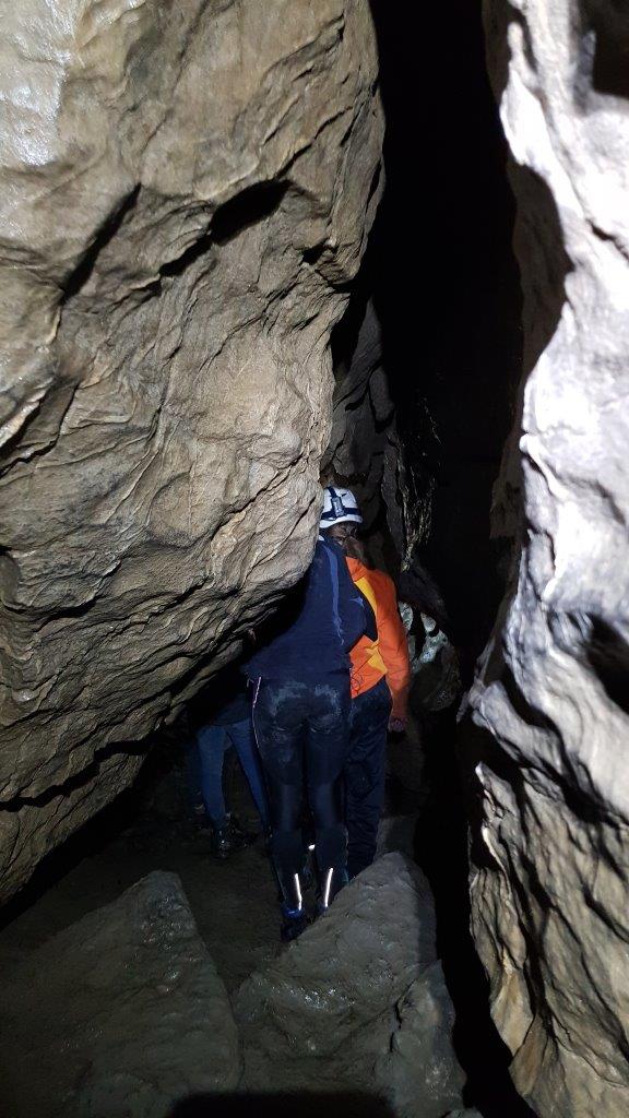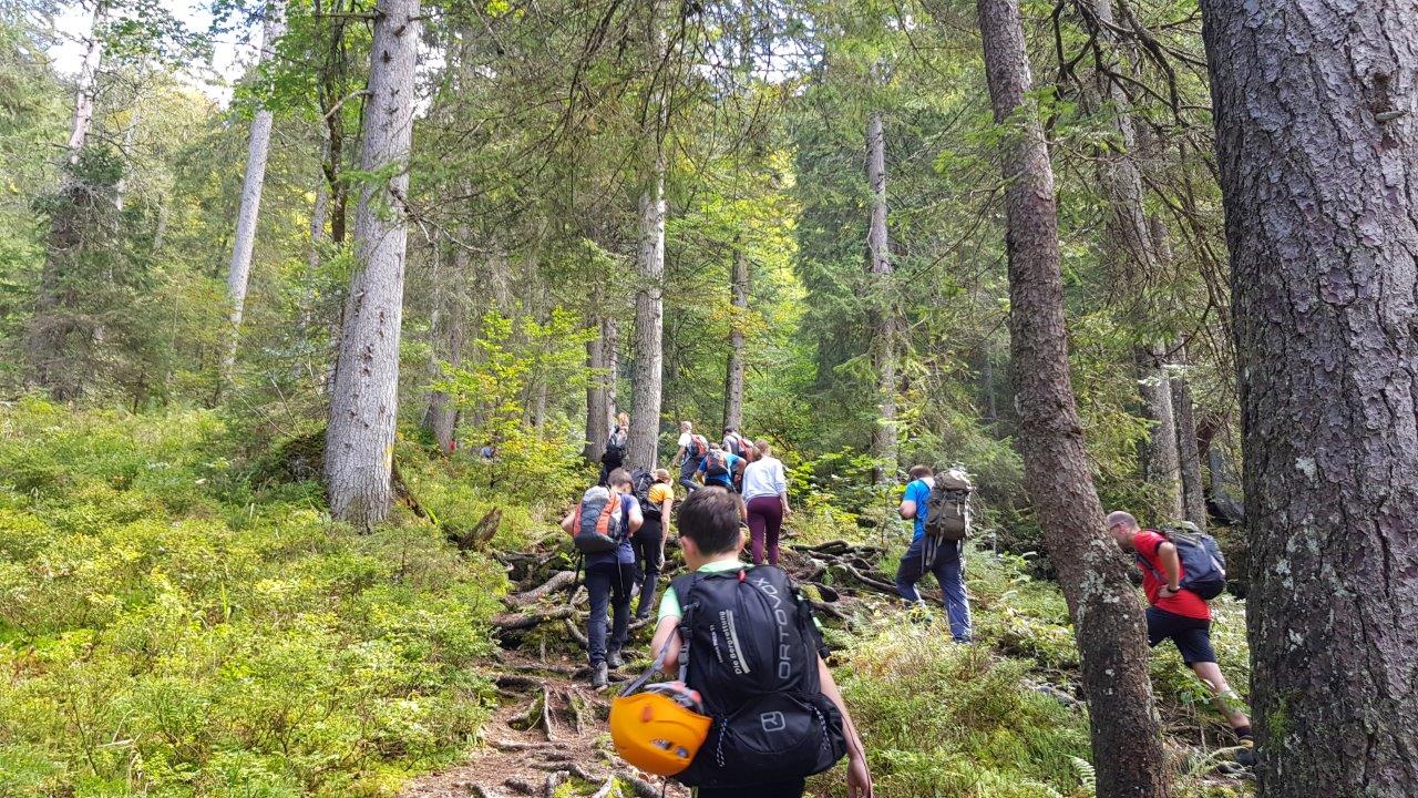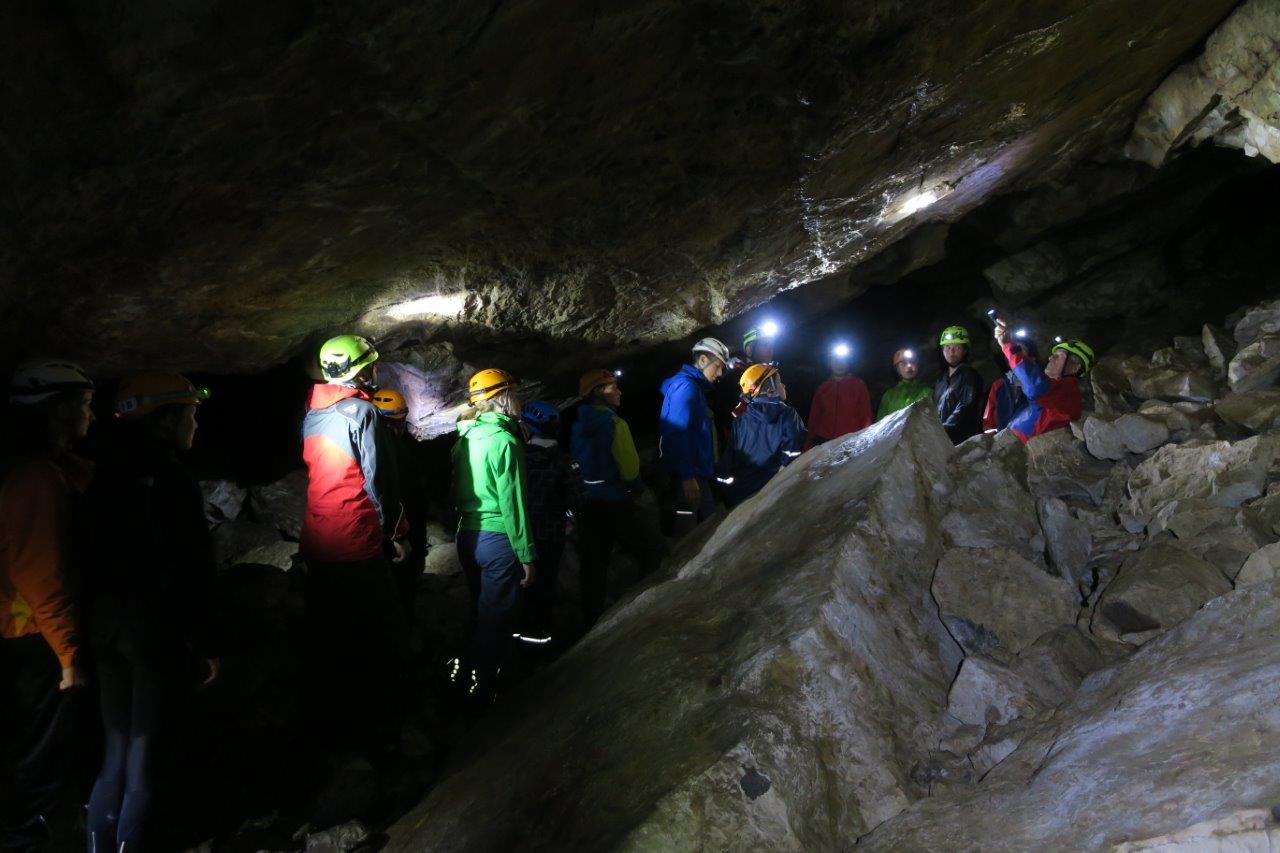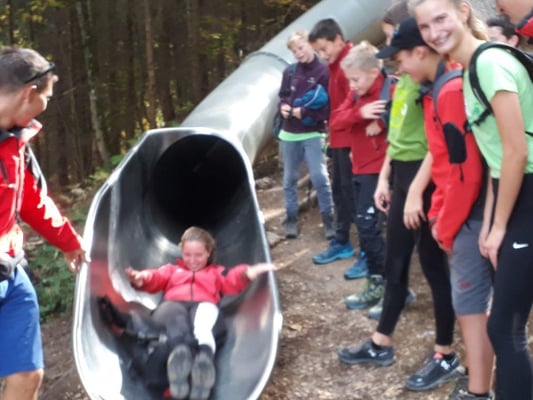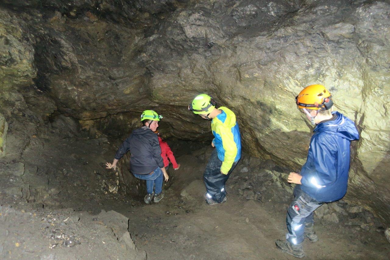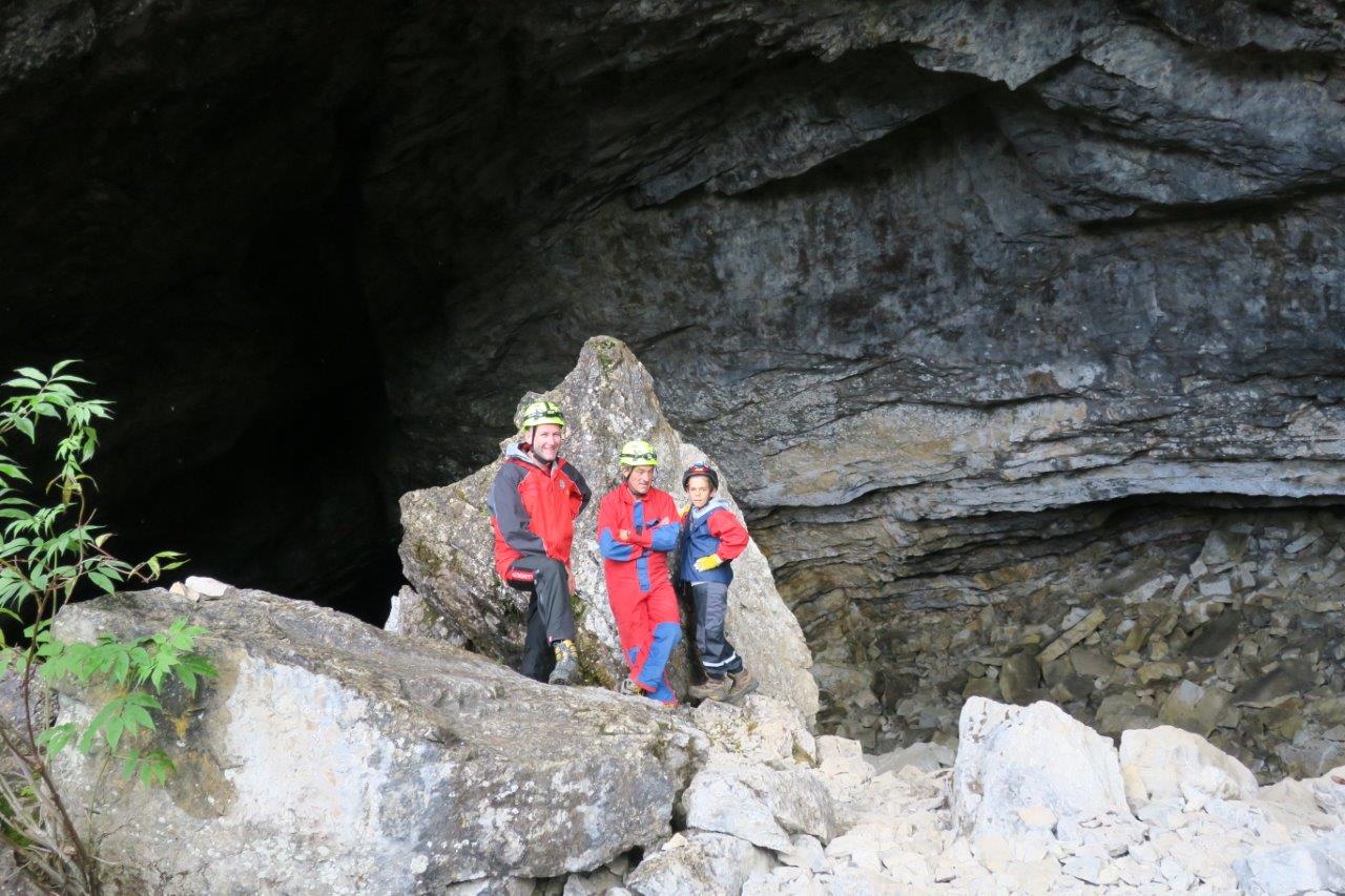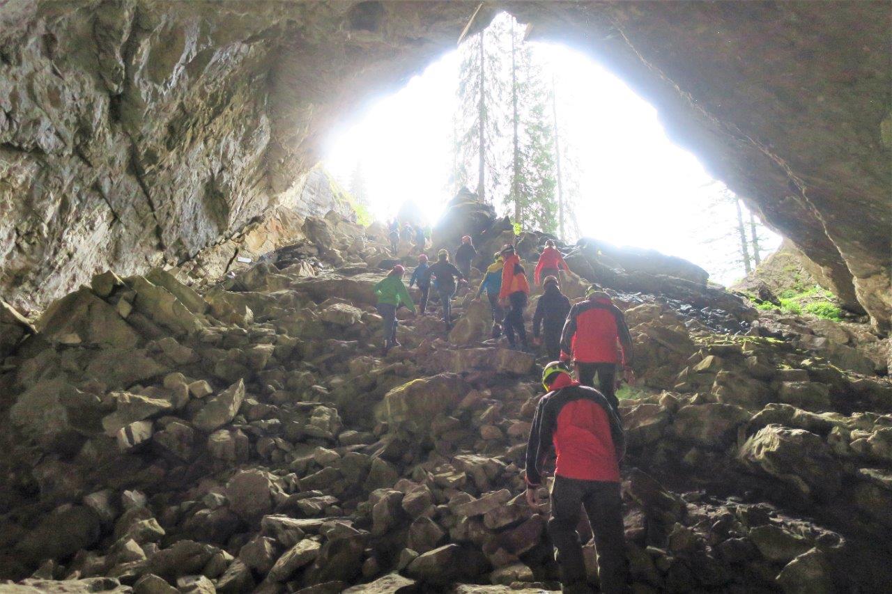 Am Samstag, dem 22. September stand die Schenkenlochhöhle auf dem Programm. Voller Vorfreude trafen wir uns um 12:00 Uhr, wie jedes Mal, im Bergrettungsheim. Anschließend fuhren wir nach Schönebach und dort warteten wir auf unseren Höhlenführer Werner Meusburger aus Bizau. Zusammen liefen wir zum Höhleneingang. Dort zogen wir unsere Helme und Stirnlampen an und wagten uns in die Höhle hinein. Zuerst war es noch eine große Halle, doch es wurde immer enger und enger, 2-mal mussten wir uns durch eine kleine, enge Spalte quetschen, dies erforderte einiges an Überwindung. In der Höhle war es stockfinster, doch zum Glück hatte jeder von uns eine Stirnlampe auf dem Helm. In der Höhle erzählte uns Werner immer wieder interessante Details zur Entstehung- und Erschließung der Höhle. Als wir dann wieder am Höhleneingang angelangt waren, machten wir uns auf den Rückweg zum Gasthaus Egender wo wir mit leckeren „Käsknöpfle“ verwöhnt wurden.