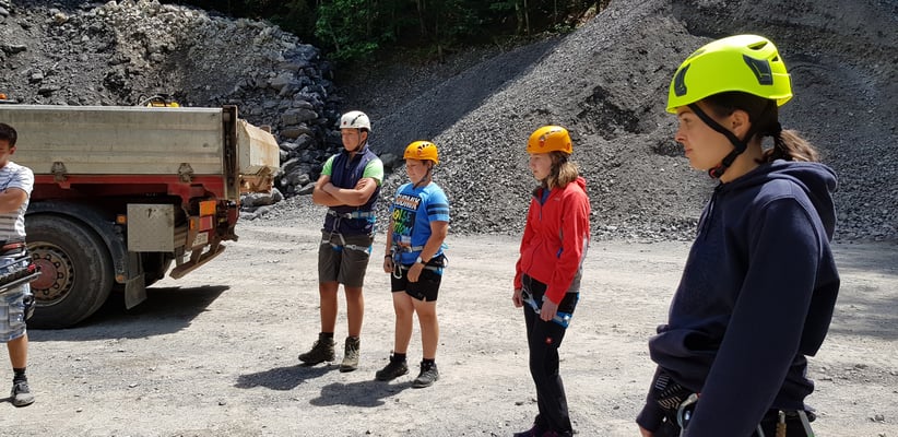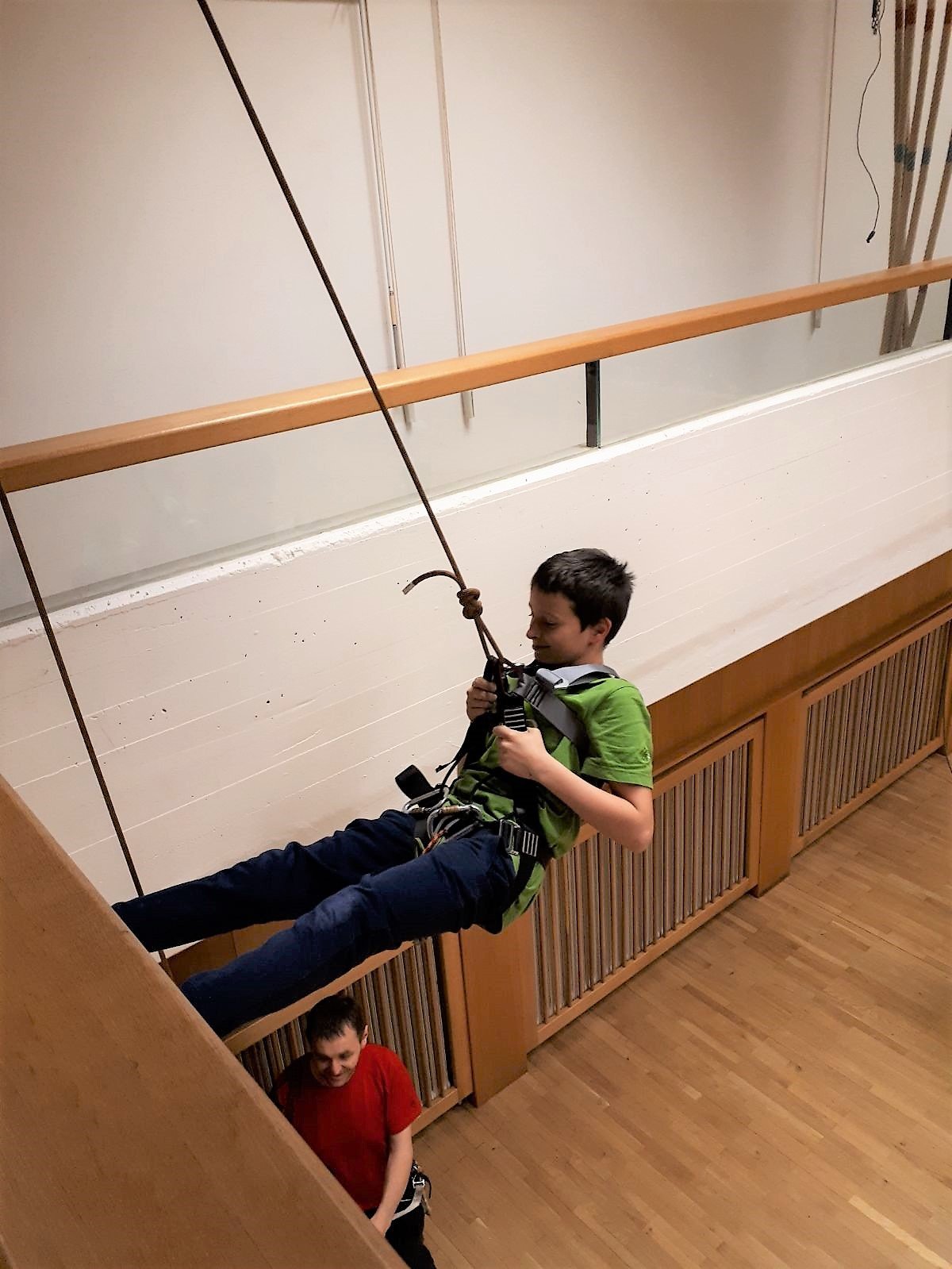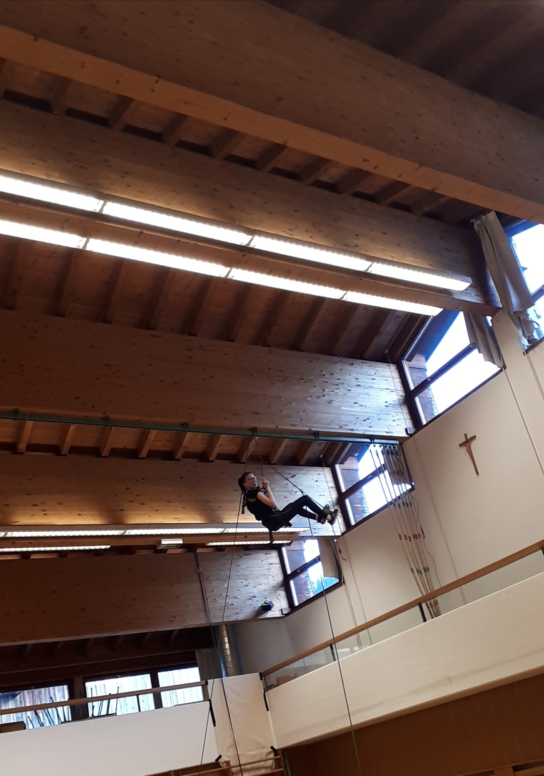 Bei einer Station zeigte man uns die erste Hilfe Ausrüstung und wo sie gelagert wird. Später durften wir am Kran eines Lastwagens, der den Ersatz für den Hubschrauber darstellte, das Evakuierungsset ausprobieren. Wir kletterten bei der nächsten Station mit verschiedenen Klemmknoten am Seil entlang. Anschließend seilten wir uns aktiv ab. Bei der letzten Station übten wir besondere Sicherungskonoten. Als wir mit den Stationen fertig waren, fuhren wir zum Spielplatz. Dort zeigte uns ein Bergretter wie viel Knoten, Seile und Karabiner aushalten können. Abschließend grillten Oswald und Dietmar für uns und wir spielten Fußball und Volleyball.