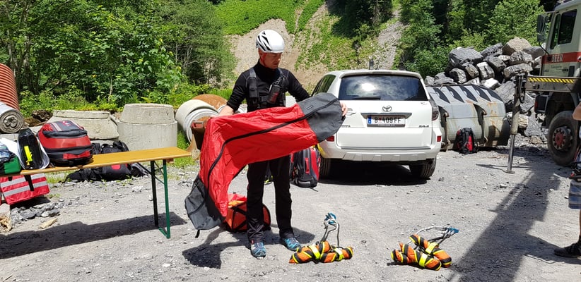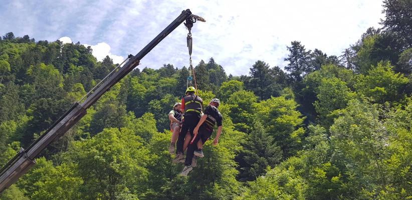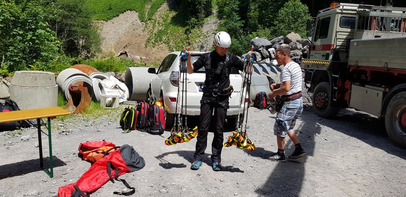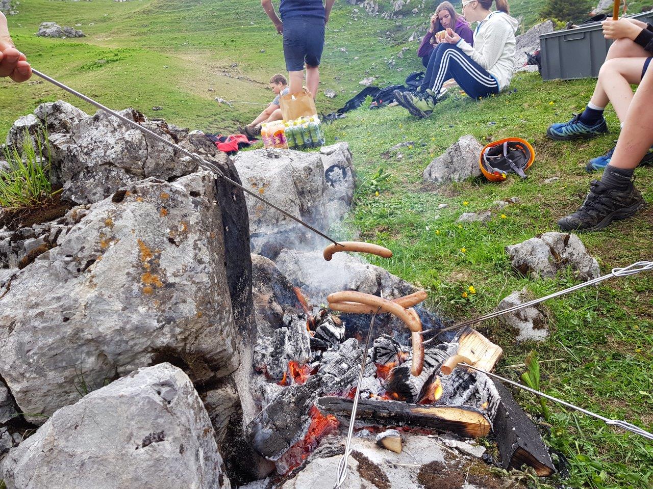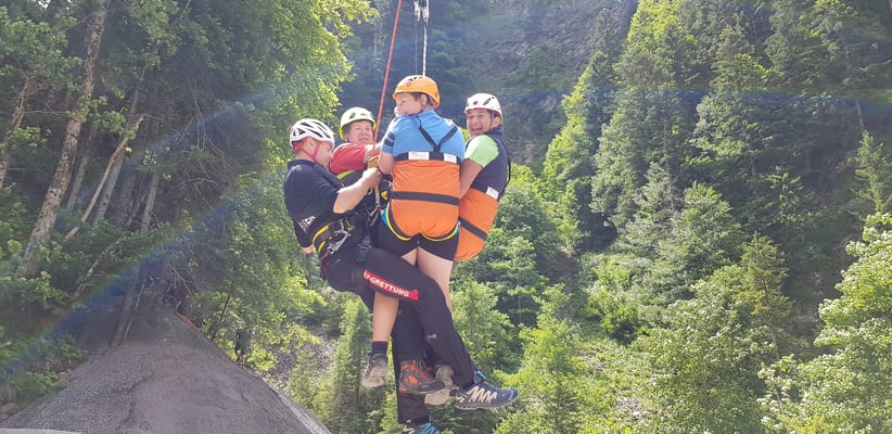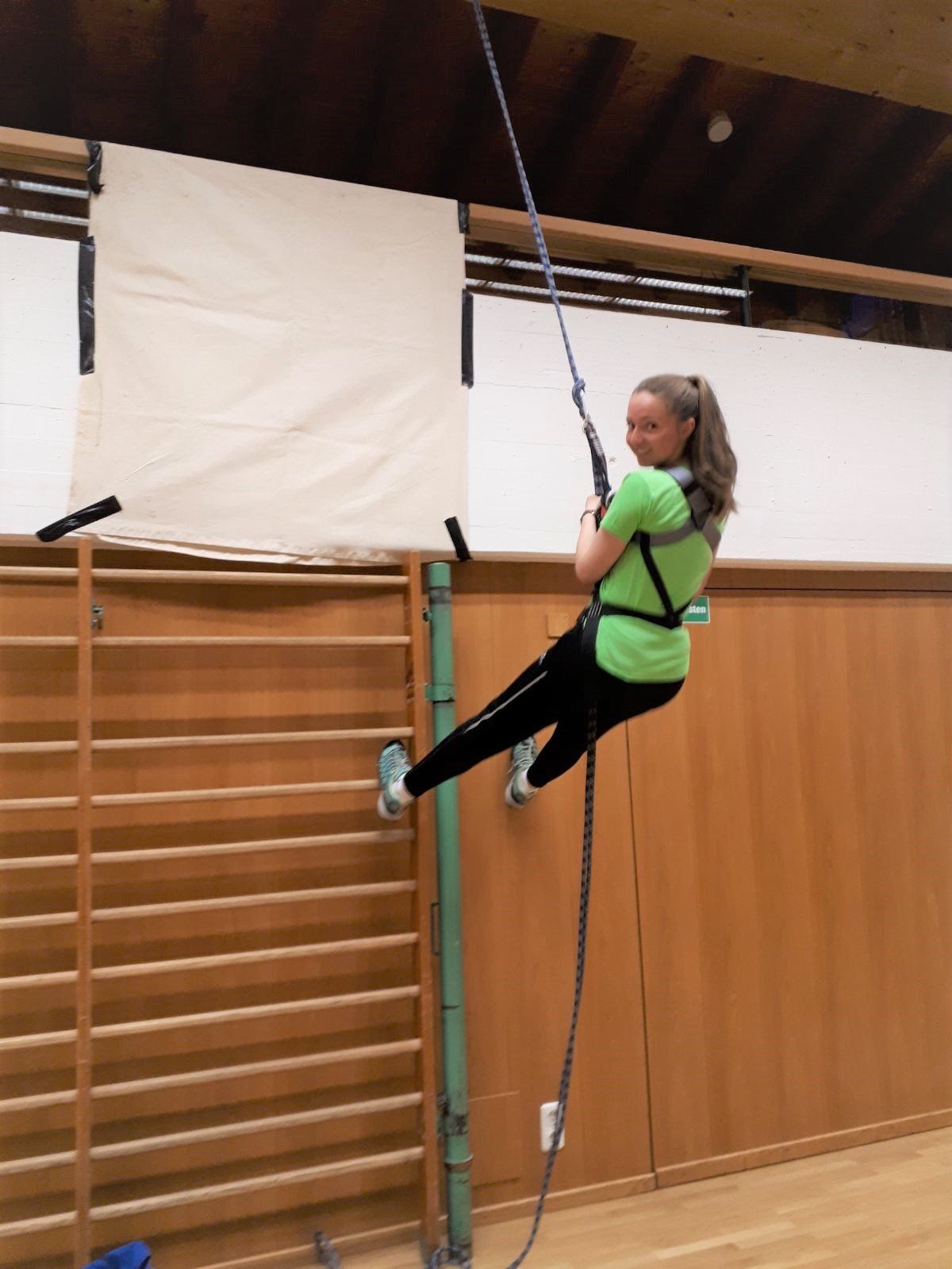 Bei einer Station zeigte man uns die erste Hilfe Ausrüstung und wo sie gelagert wird. Später durften wir am Kran eines Lastwagens, der den Ersatz für den Hubschrauber darstellte, das Evakuierungsset ausprobieren. Wir kletterten bei der nächsten Station mit verschiedenen Klemmknoten am Seil entlang. Anschließend seilten wir uns aktiv ab. Bei der letzten Station übten wir besondere Sicherungskonoten. Als wir mit den Stationen fertig waren, fuhren wir zum Spielplatz. Dort zeigte uns ein Bergretter wie viel Knoten, Seile und Karabiner aushalten können. Abschließend grillten Oswald und Dietmar für uns und wir spielten Fußball und Volleyball.