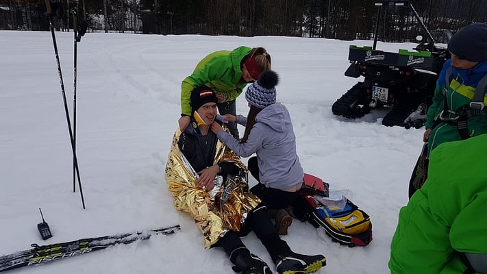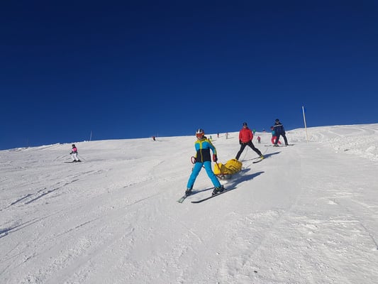 Oben angekommen wurde zuerst das Thema Pistendienst besprochen, danach erfolgte eine Auffrischung in Erste Hilfe. Wie man eine Infusion vorbereitet und andere spannende Sachen zum Thema Erste Hilfe erklärte uns Daniel. Die andere Gruppe beschäftigte sich mit dem Akjafahren, auch abseits der Piste. Auch die Jugendbergrettung durfte das Fahren mit dem Akja ausprobieren.