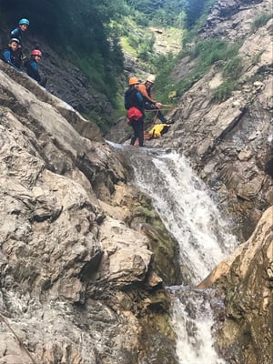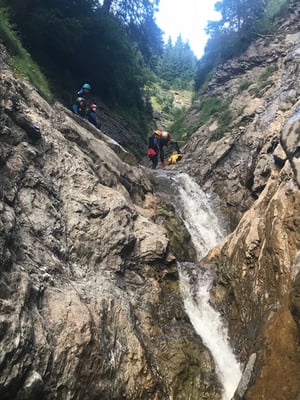 Nach einigen Absagen trafen wir uns am 11. August endlich zum Canyoning. Gemeinsam fuhren wir zum Holzschopf, dort wurden wir mit Klettergurten und Neoprenanzügen ausgestattet. Bevor wir starteten, wiederholten wir kurz das Abseilen an der Hauswand. Zum Einstieg mussten wir uns in einen kleinen See legen um unseren Neoprenanzug zu füllen. Nach dieser ersten Abkühlung bekamen wir noch die wichtigsten Infos und machten uns auf den Weg mitten durch die Bregenzerache talwärts. Immer wieder rutschten wir über Steine hinunter, liefen mitten in der Ache und wurden durch Wasserfälle abgeseilt. Einige nahmen auch ein ungewolltes Bad oder tauchten weiter ein als gedacht. Doch irgendwann begann es mache trotz Neoprenanzug zu frieren und wir beschlossen bei der nächsten Möglichkeit auszusteigen. Wieder im Holzschopf angekommen zogen wir die nassen Neoprenanzüge aus. Zum Abschluss gab es noch Pizza und etwas zu trinken im Holzschopf. Wir hatten einen lustigen Ausflug und es war toll einmal etwas Neues auszuprobieren. Ein großer Dank an unsere Begleiter Christian und Jürgen sowie an Jürgen Strolz für die Bereitstellung der Canyoning Ausrüstung.