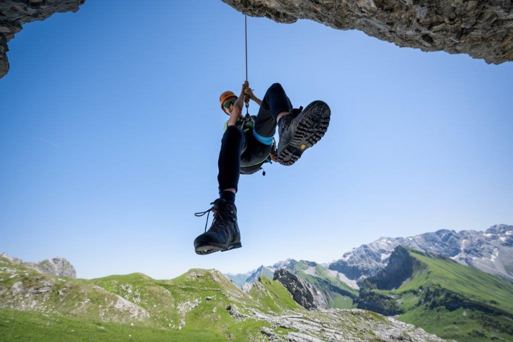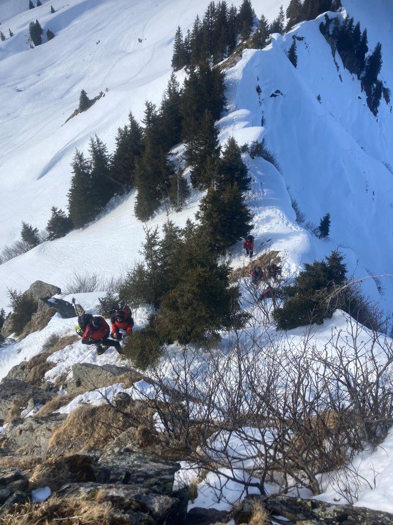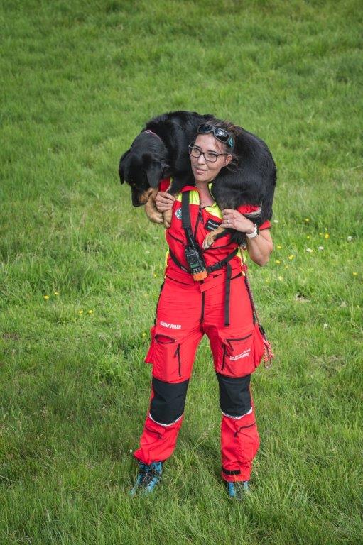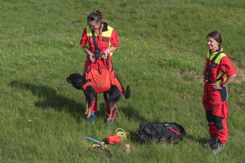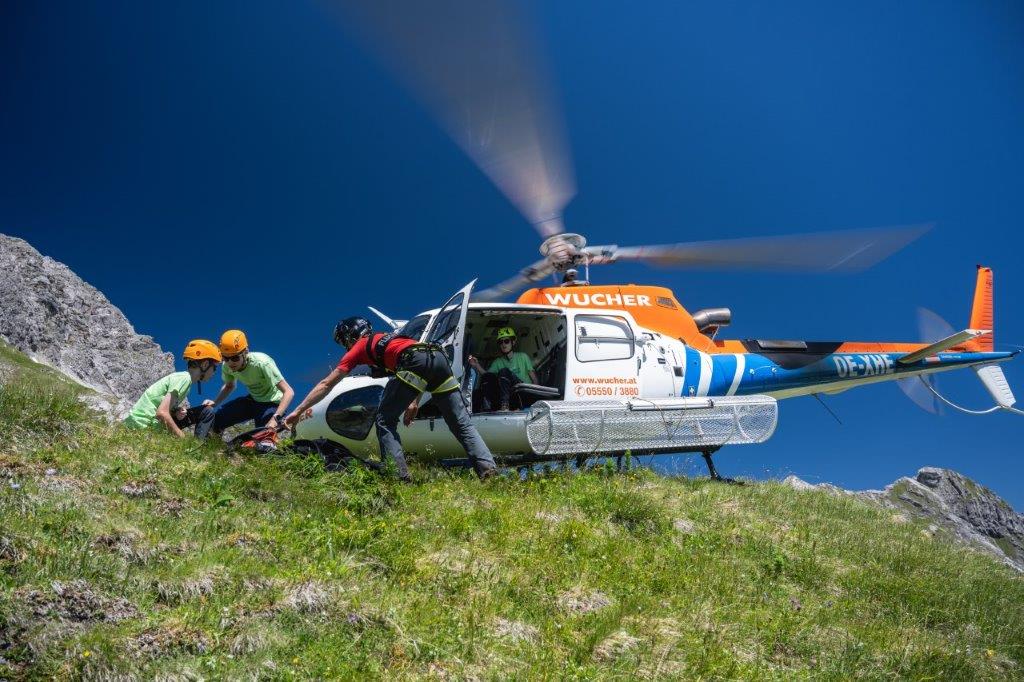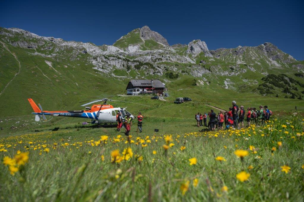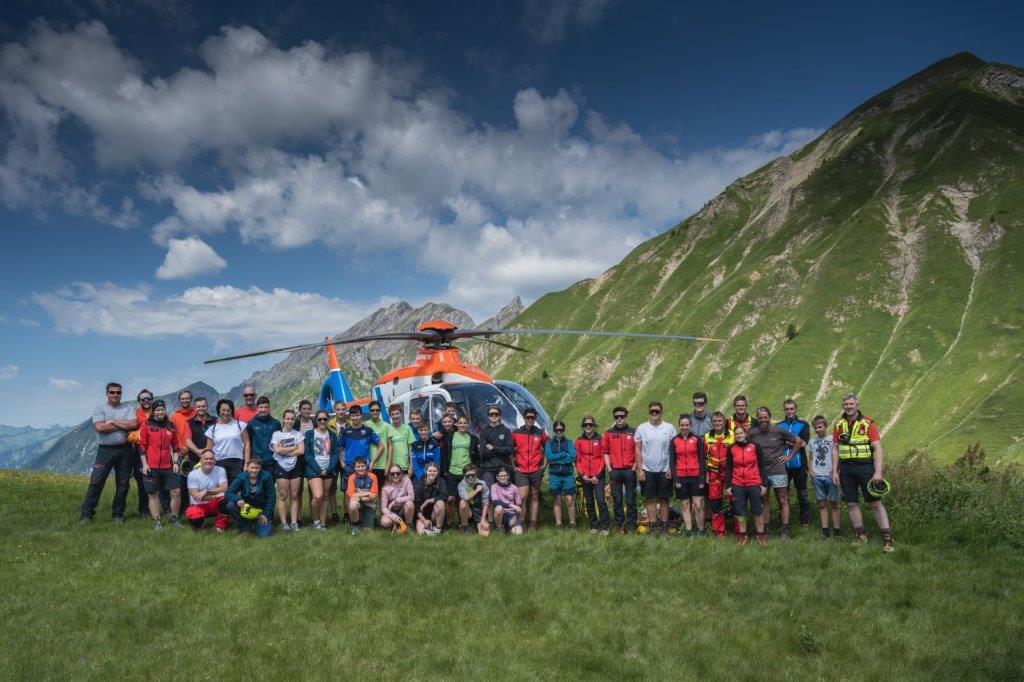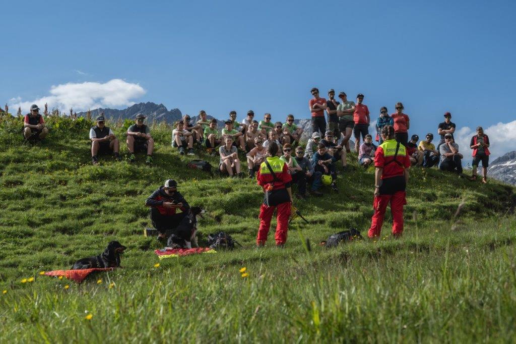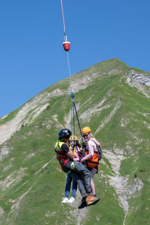 Wenige Minuten später trafen Magdalena, Marianne und Laurens von der Hundestaffel Vorarlberg mit ihren Hunden bei uns ein. Nach einem kurzen Vortrag zur Ausbildung als Hundeführerin gingen wir ins Gelände und sie zeigten uns verschiedene Methoden wie die Hunde vermisste oder verschüttete Personen finden können. Nach dieser sehr interessanten Vorführung ging es weiter mit den Tauflügen am Rettungshubschrauber Gallus 3. Die Hubschrauberausbildung gehört mittlerweile zur Grundausbildung jeden Bergretters und Bergretterin, um im Notfall schnell zur Unglücksstelle zu gelangen. Stefan Ganahl, Flugbetriebsleiter der Firma Wucher, brachte uns die technischen Details des Hubschraubers näher und informierte uns über den Ablauf der Tauflüge. Die Flugretter Artur Köb und Dieter Bischof waren für die Sicherheit am Tau verantwortlich. Der Flug am Tau war ein aufregendes und cooles Erlebnis.
