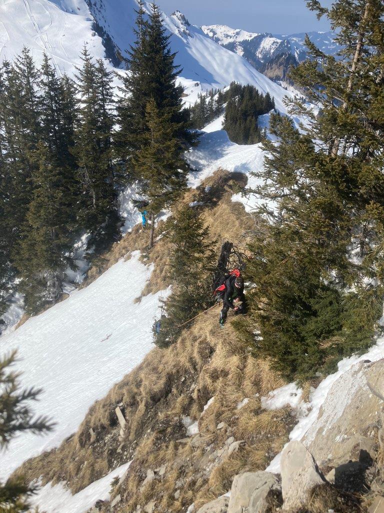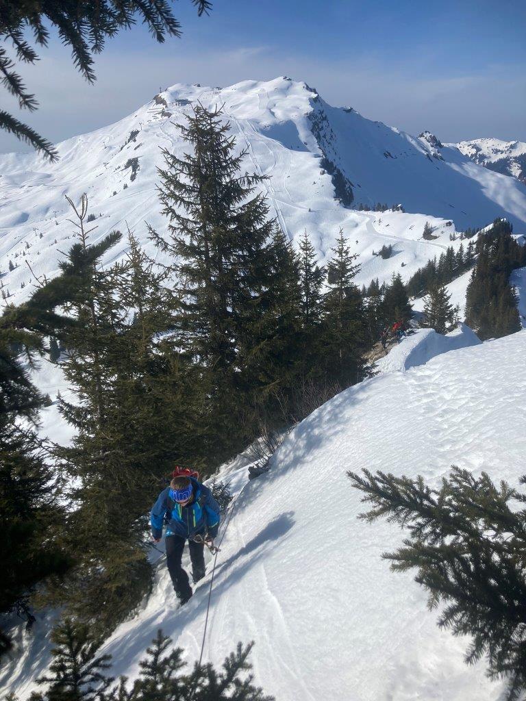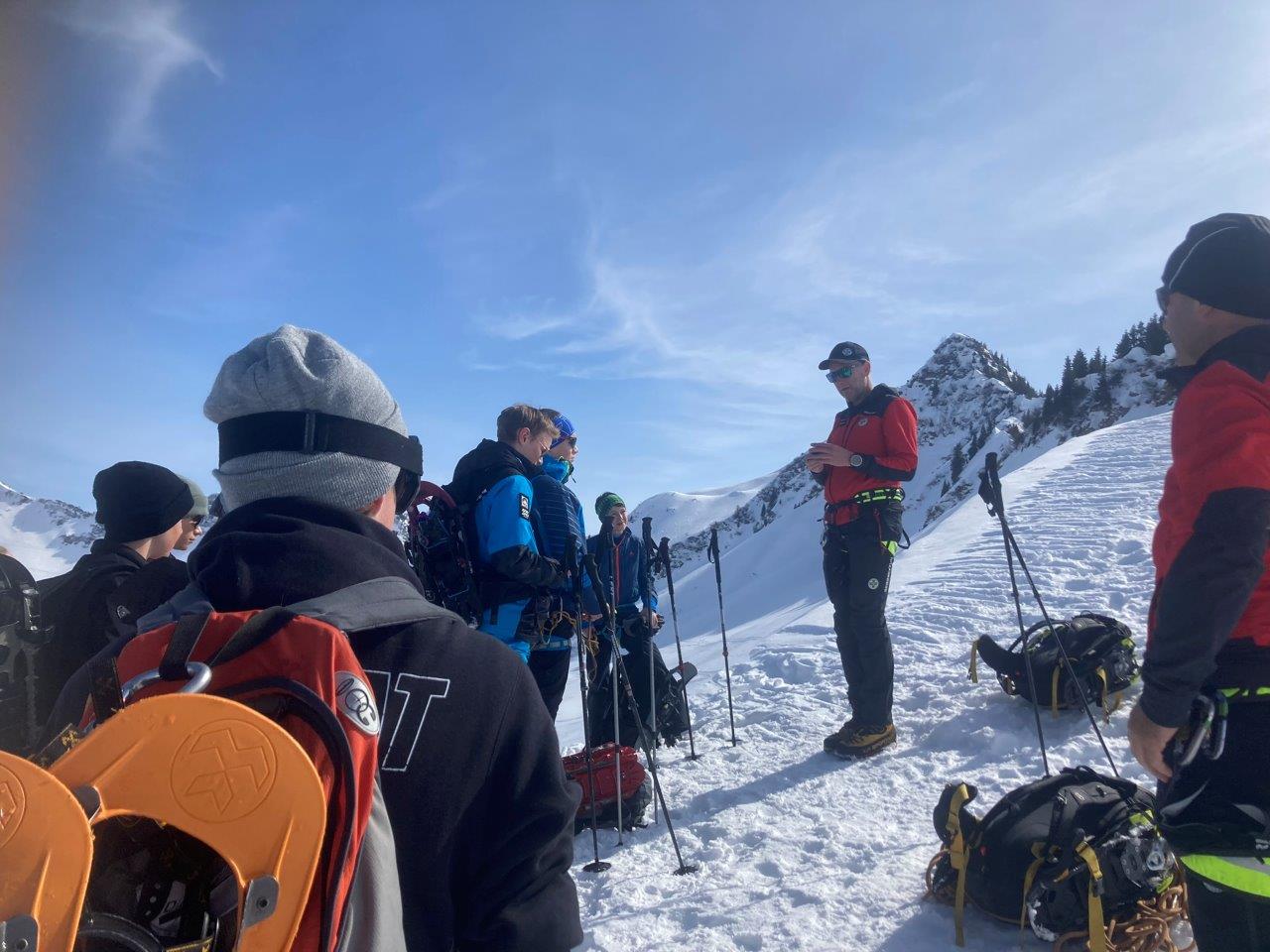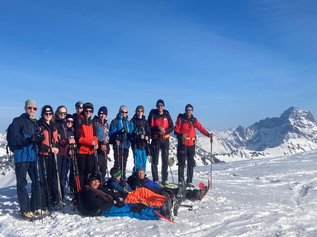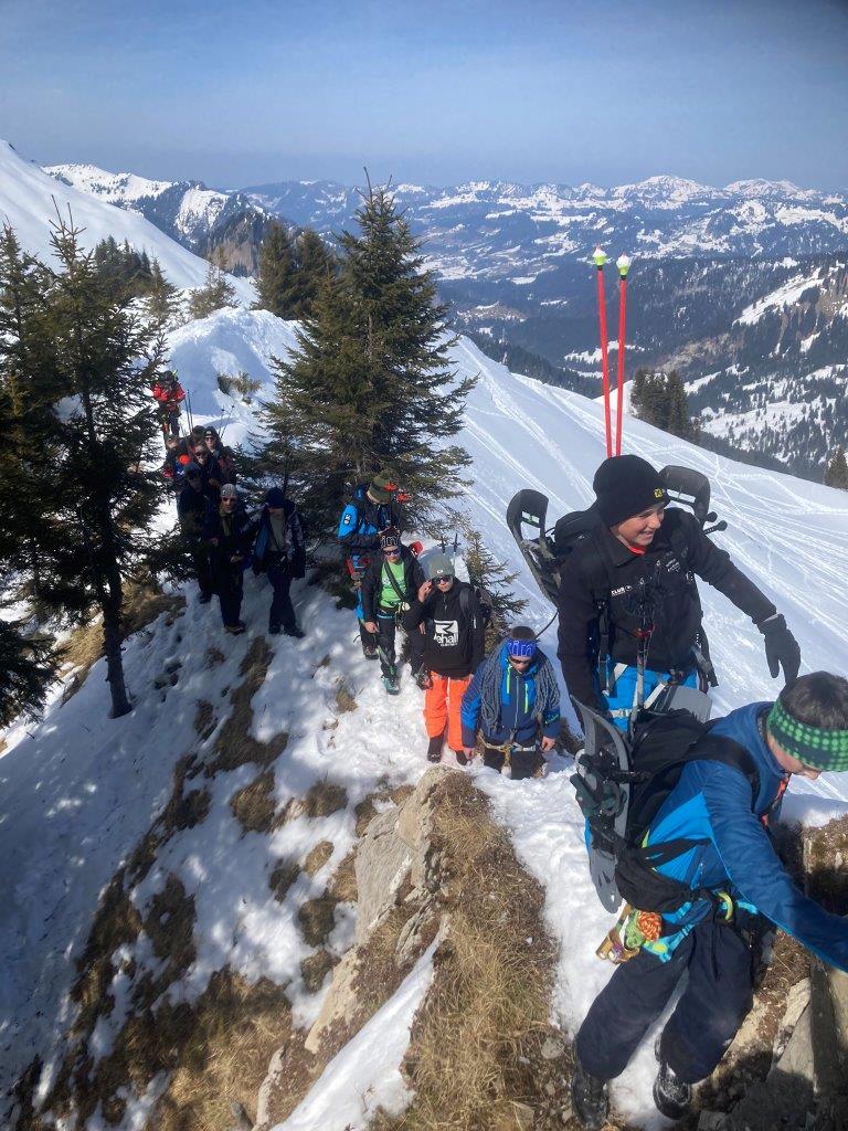 Am Samstag, den 12.03.2022 trafen wir uns um 12:30 Uhr an der Talstation der Bergbahnen Diedamskopf. Hier wurde uns der Ablauf des Nachmittags erklärt. Anschließend fuhren wir mit der Gondel zur Bergstation. Mit den Schneeschuhen wanderten wir gemeinsam zum Kreuzle. Nachdem wir die Schneeschuhe an den Rucksack befestigten und unseren Klettergurt angezogen haben, ging es über den Grat, am Seil Richtung Falzer Kopf.