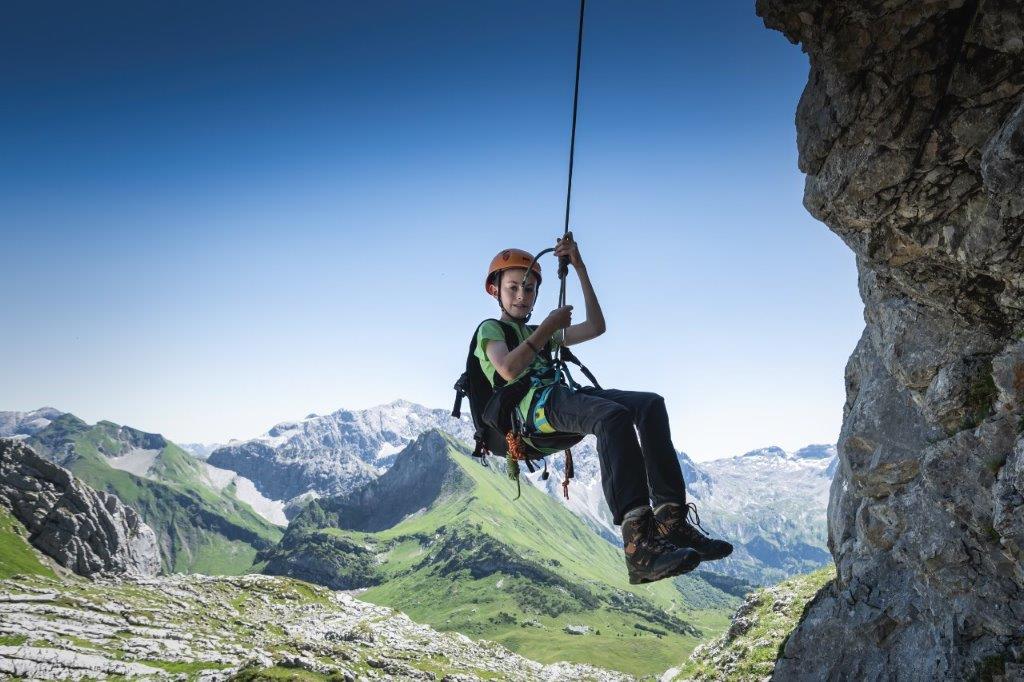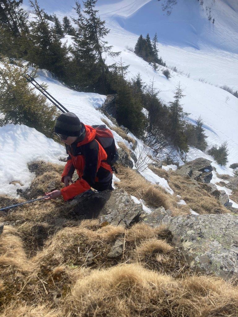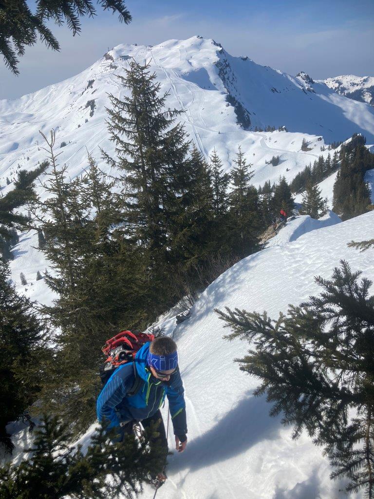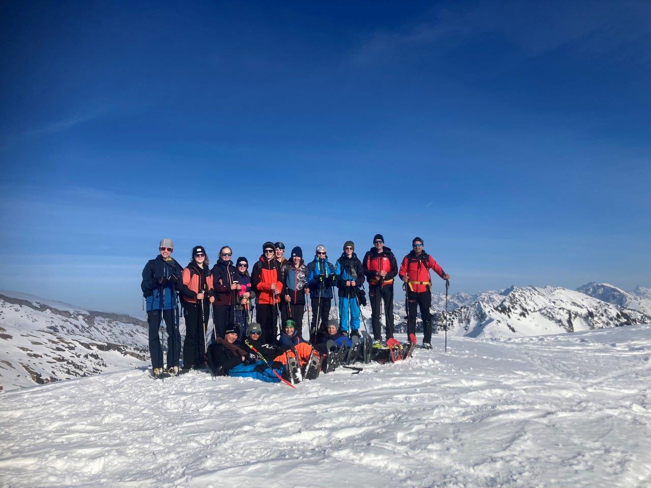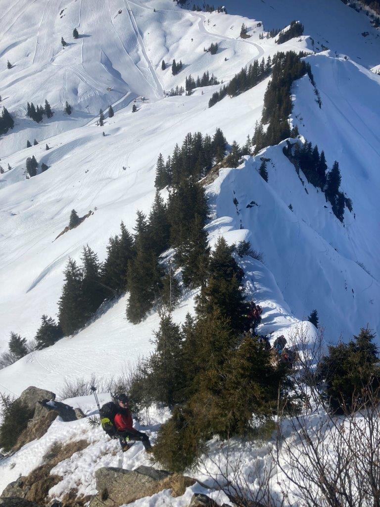 Am Samstag, den 12.03.2022 trafen wir uns um 12:30 Uhr an der Talstation der Bergbahnen Diedamskopf. Hier wurde uns der Ablauf des Nachmittags erklärt. Anschließend fuhren wir mit der Gondel zur Bergstation. Mit den Schneeschuhen wanderten wir gemeinsam zum Kreuzle. Nachdem wir die Schneeschuhe an den Rucksack befestigten und unseren Klettergurt angezogen haben, ging es über den Grat, am Seil Richtung Falzer Kopf.