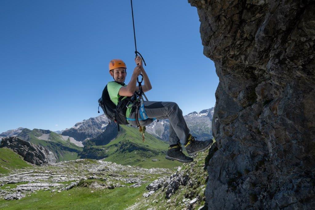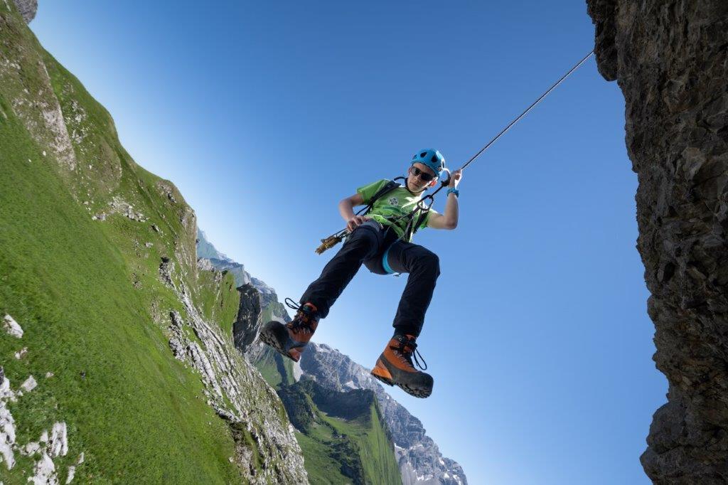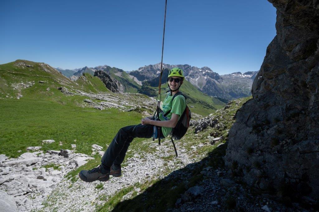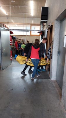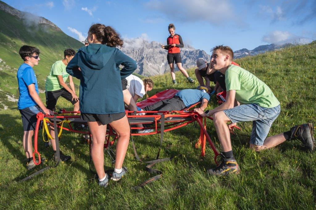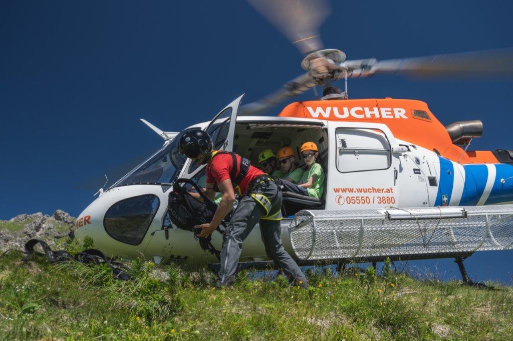 Dort angekommen bezogen wir unser Matratzenlager und holten uns dann auch gleich ein Lunch Packet. Als nächstes stand auf dem Programm der Hubschrauber. Nach kurzen Erklärungen der Crew, ging es dann schon in die Lüfte. Immer zu fünft flogen in Richtung Künzel, genauer gesagt zum Gigelturm. Dort oben gab es drei Stationen: als erstes Abseilen von einer Wand, als zweite Station Verankerungsbau mit mobilen Sicherungsgeräten und als drittes Klettern am Gigeltum. Als alle die Stationen abgeschlossen haben, ging es zurück zur Hütte. Dort gab es ein 3 gängiges Menü und etwas zu trinken. Nach dem Abendessen stand noch ein Erste Hilfe Wettbewerb auf dem Plan. Wir wurden in drei Gruppen aufgeteilt und alle mussten einer verletzten Person Erste Hilfe leisten und mit der Trage abtransportieren. Dieser Bewerb war sehr lustig und vor allem lehrreich. Die Beobachter gaben uns noch wichtige Tipps was beim nächsten Mal verbessert werden kann. Anschließend wurde in der Gaststube noch eine Runde „ gemäxelt“ bevor wir müde ins Bett fielen.
