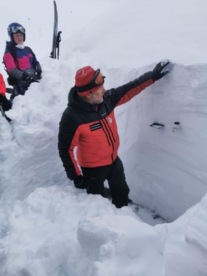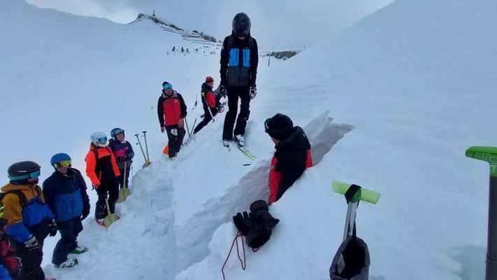 Dietmar Moosbrugger, langjähriges Mitglied der Lawinenkommission, hat für uns ein Schneeprofil erstellt und hat uns die verschiedenen Schichten gezeigt und erklärt. Das Schneeprofil haben wir dann zu einem Rutschblock ausgebaut und wir haben getestet, ob eine Lawine ausgelöst werden kann. Nach der Mittagspause wurden wir in drei Gruppen aufgeteilt und weitere Themen wie der Lawinen-lagebericht oder Standardmaßnahmen im lawinengefährlichen Gelände besprochen.