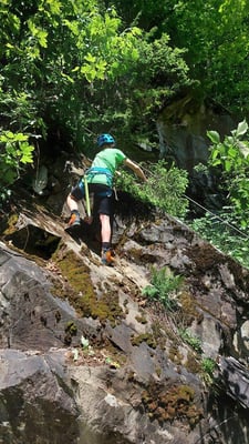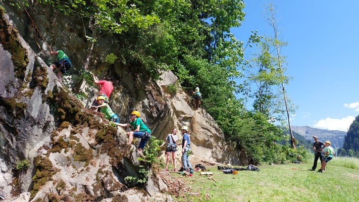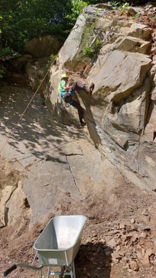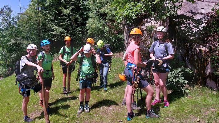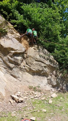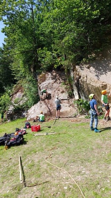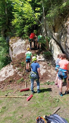 Zuerst mussten wir 3 Verankerungen an den Bäumen oberhalb des Steinbruchs bauen, wo wir uns nachher sichern konnten. Dann mussten zuerst die losen Steine und die lose Erde heruntergekratzt werden. Zwischendurch konnten wir unseren Durst mit einer Limonade stillen. Dann ging es weiter und wir bohrten noch Löcher in die Felsen und haben mit Schraubankern Zwischensicherungen und einen Stand verbaut.