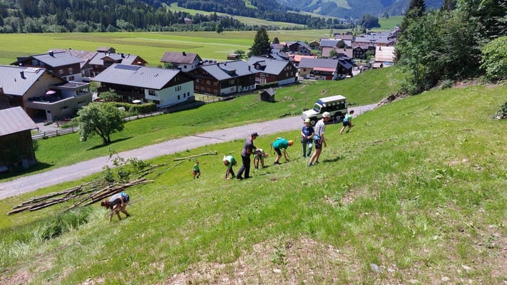 Die zweite Gruppe ist über einen anderen Track auch dort hingekommen. Gruppe 2 folgte einer Route, die sie zur Tobel Alpe führte. Die andere Gruppe folgte einem Track die sie in Richtung „Stieg“ führte und von dort aus durch den Wald zum Vorsäß Boden. Auf dem Weg dort hin mussten wir immer wieder verschiedene Aufgaben erledigen. Kurz vor dem Ziel haben sich die zwei Gruppen verschiedene Koordinaten geschickt. Ziel war es, der anderen Gruppe von ihrem Standpunkt aus, eine Route zum Endpunkt der Tour zu planen und diese per Handy zu übermitteln. Das Ziel war die Alpe Annalperau. Dort angekommen, haben wir eine Limo getrunken und eine Leberkässemmel gegessen. Dann wurden wir abgeholt.