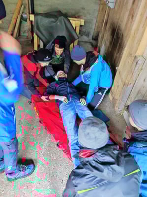 Nach dem leckeren Abendessen ging es weiter mit einem kleinen Erste Hilfe Wettbewerb. Wir wurden in drei Gruppen aufgeteilt, jede Gruppe bekam eine Trage und einen Erste Hilfe Rucksack, womit der jeweilige Patient versorgt werden musste. Bevor es los ging, wurden noch die verschiedenen Aufgaben zugeteilt und besprochen wie die Gruppen vorgehen sollen und wer welche Rolle bekommt. Dann begann der „Wettbewerb“ und alle Teams machten sich auf den Weg ihren Patienten zuerst einmal zu finden und dann natürlich auch zu versorgen und zum Schluss sicher zurück zum Ausgangspunkt zu bringen.