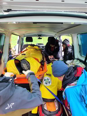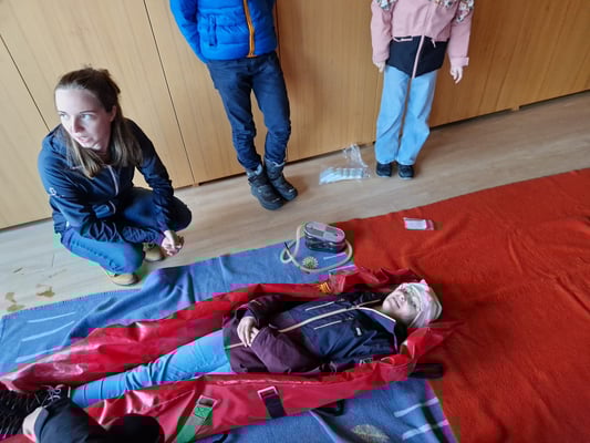 Am Samstag, den 23. März, trafen wir uns bei der Bergstation Diedamskopf. Dort sind wir in das Panoramarestaurant gegangen und haben verschiedene Techniken im Erste Hilfe Bereich gelernt. Uns wurde erklärt, welche verschiedenen Möglichkeiten es gibt, eine einfache Rettungsdecke anzuwenden. Angefangen von einer provisorischen Sonnenbrille, einem Schulterverband, Tragring bis zum Wärmerhalt, war alles dabei. Sam Splint, ein weiteres einfaches, aber sehr nützliches Hilfsmittel zum ruhig stellen von Knochenbrüchen. Wir probierten die verschiedenen Anwendungsmöglichkeiten bei unserem Partner aus. Nach der Theorie im warmen Restaurant gingen wir ins Freie. Dort wehte ein stürmischer Wind und die Sicht war sehr schlecht. Wir machten trotz der widrigen Bedingungen eine Übungsfahrt mit dem Akja. Wir wurden zu einem Skiunfall gerufen, ein Verletzter mit leichter Unterkühlung und einer Arm Verletzung. Nun konnten wir das vorher gelernte am Patienten anwenden und diesen gut versorgen, anschließend wurde der Patient ins Akja verladen und zur Mittelstation gebracht. Im Ski Inn gab es zum Abschluss noch etwas zum Trinken, bevor es wieder nach Hause ging.