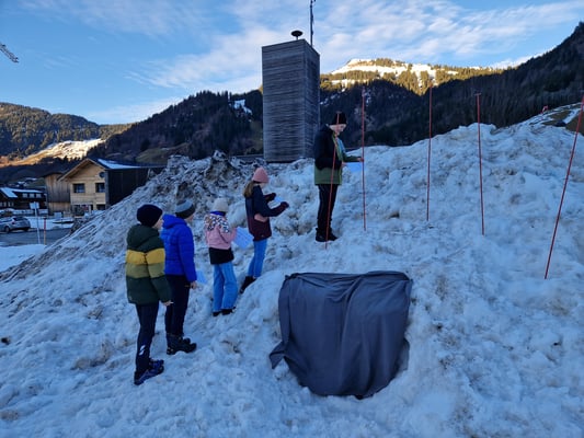 Auch die Winterausrüstung haben wir ausprobiert. In einem Schneehaufen wurden fünf Lawinensonden vorbereitet, unter denen verschiedene Gegenstände wie ein Skischuh, ein Stein, Gras/Erde, ein