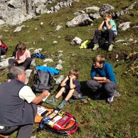 GPS-Gerät auch auf Schatzsuche gehen. Nach der Stärkung machten wir beim Klettergarten südseitig der Biberacher Hütte gemeinsam die Grundlagen der Erste-Hilfe. Anschliessend ging es für die