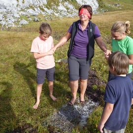 Eltern, geführt von Ihren Kindern mit verbundenen Augen durch den Barfuß-Parcour ;)
