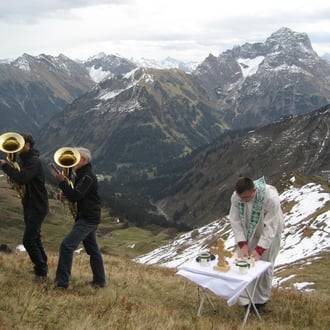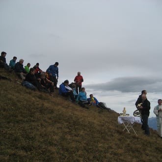 Anläßlich des 5-jährigen Bestehens des Gipfelkreuzes auf dem Grünhorn hat Raimund wieder eine Messe organisiert. Pater Johannes zelebrierte die Messe. Natürliche wurde diese auch von unseren Musikanten aus Andelsbuch begleitet. Ca. 50 Personen nahmen an der Gipfelmesse teil.