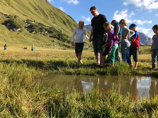 Am Samstag, den 24. September ging es dann an die Praxis. Bei bestem Wetter starteten wir um 08:30 h beim Landsteg. Unser Weg führte uns zur Biberacher Hütte, wo wir am Mittag eine kurze Pause einlegten. Auf dem Weg dort hin konnten die Kinder mit Karten und Hinweisen auf Schatzsuche gehen. Nach der Stärkung machten wir beim Klettergarten südseitig der Biberacher Hütte gemeinsam die Grundlagen der Erste-Hilfe. Weiters konnten sich Kinder und Eltern beim Klettern versuchen. Anschließend ging es für die Eltern, geführt von Ihren Kindern mit verbundenen Augen durch den Barfuß-Parcour ;)